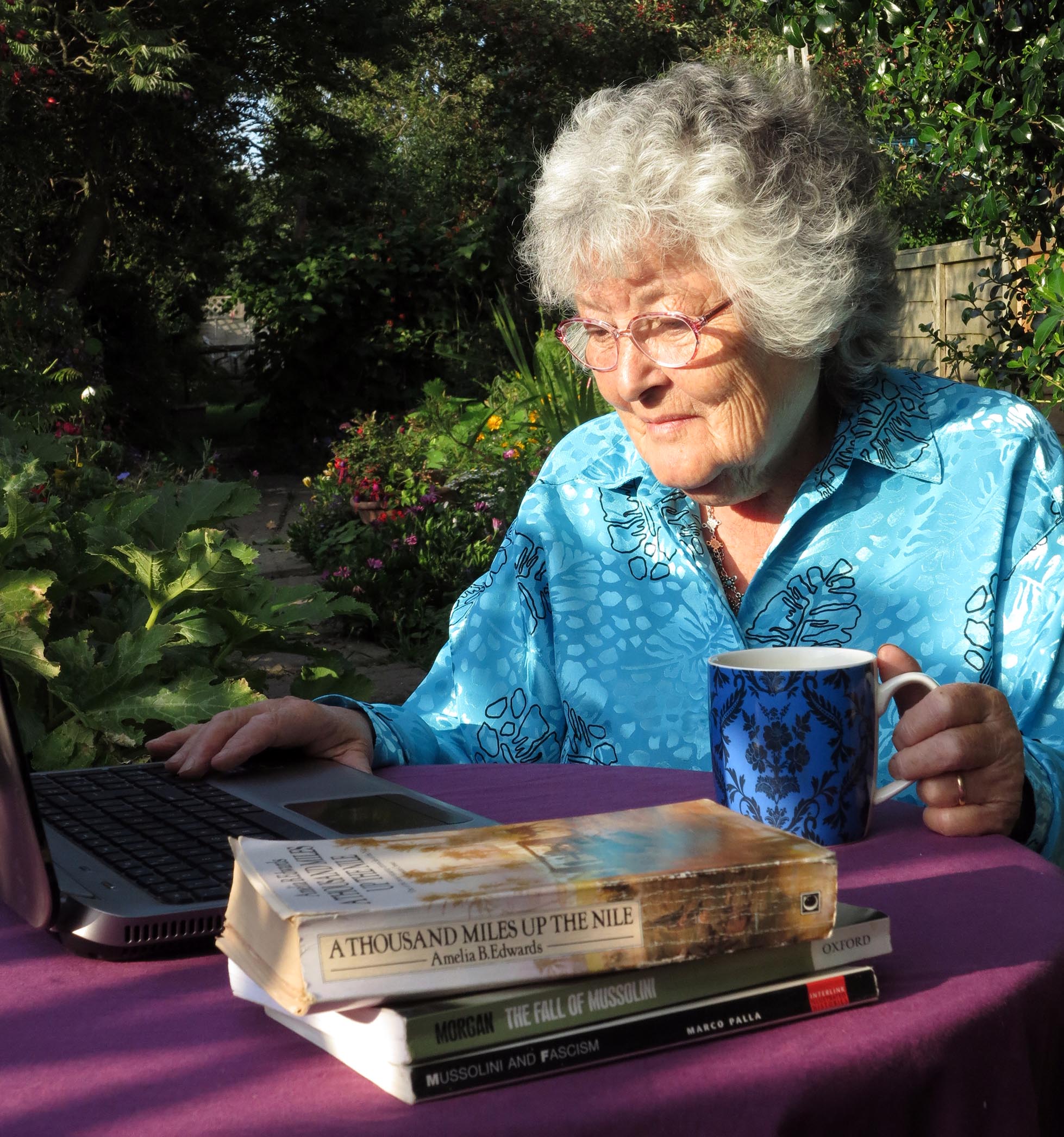 Joan works on a book in her garden